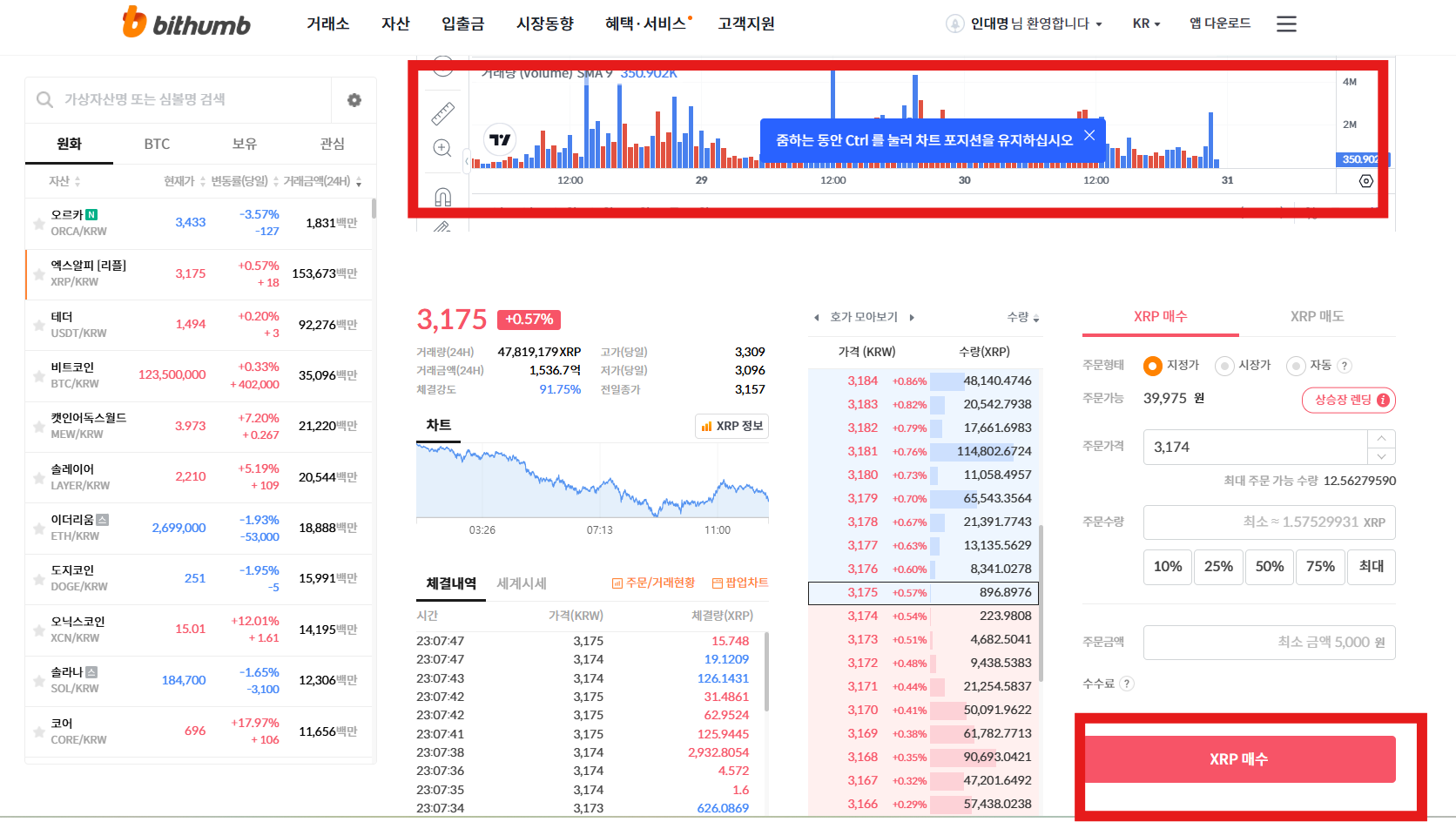 빗썸의 거래 화면은 다음과 같은 요소로 구성돼 있어요: