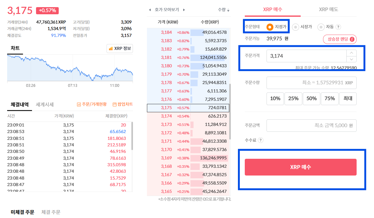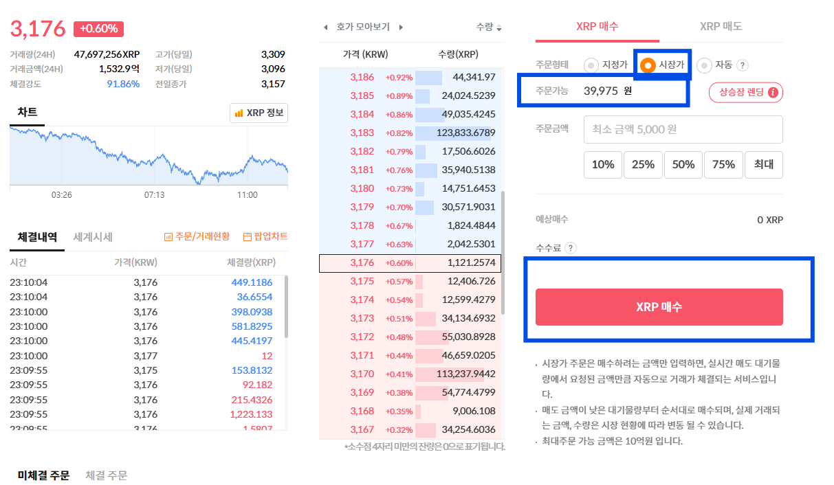 주문 창에서 "시장가" 탭을 선택하고, 매수할 금액(원화)이나 수량(코인)을 입력합니다. - Step 3: 주문 실행