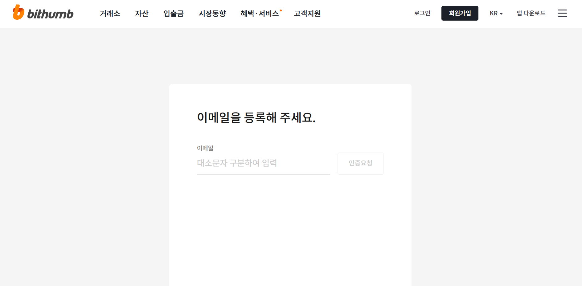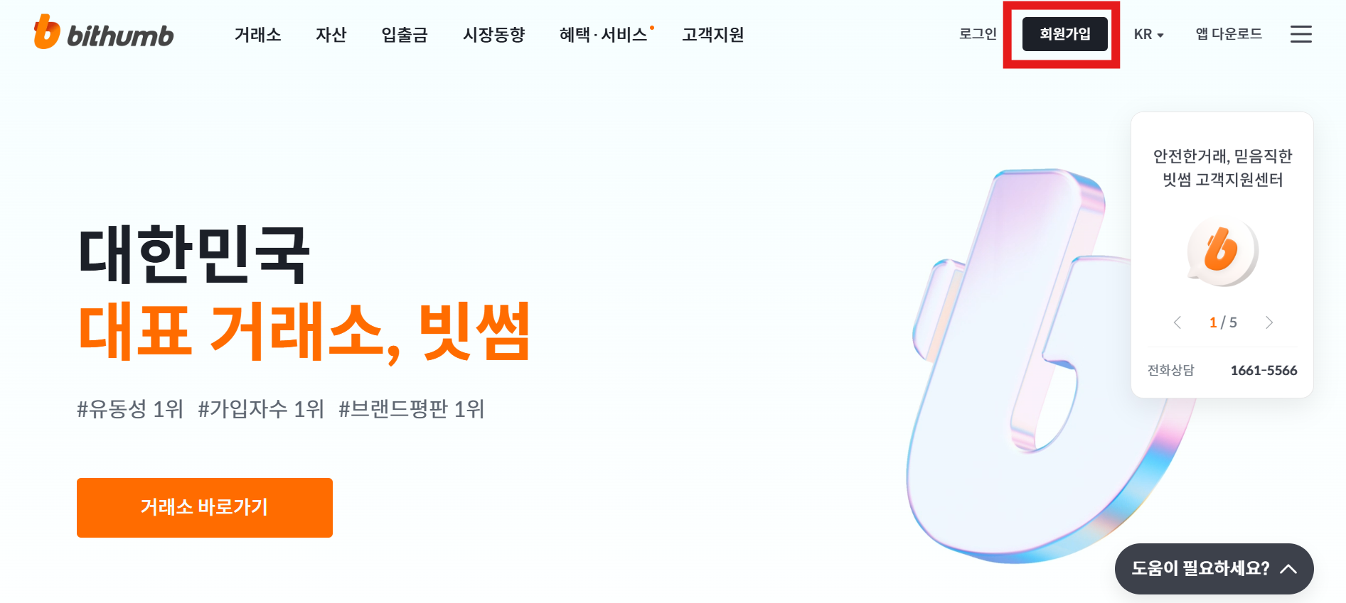 브라우저를 열고 빗썸 공식 사이트에 접속합니다. 오른쪽 상단에 있는 "회원가입" 버튼을 클릭하세요.
