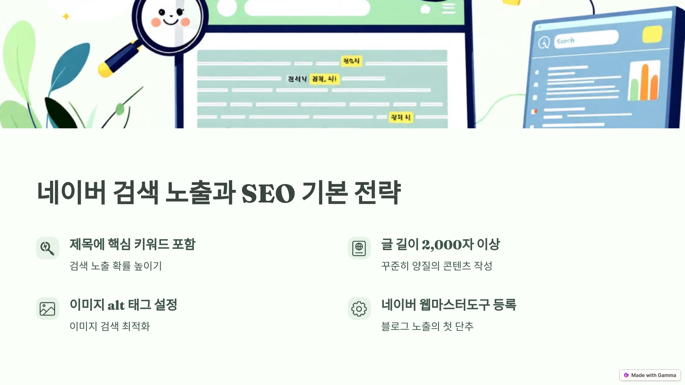꾸준한 포스팅과 웹마스터도구 등록, SEO 최적화를 함께 진행해야 합니다.