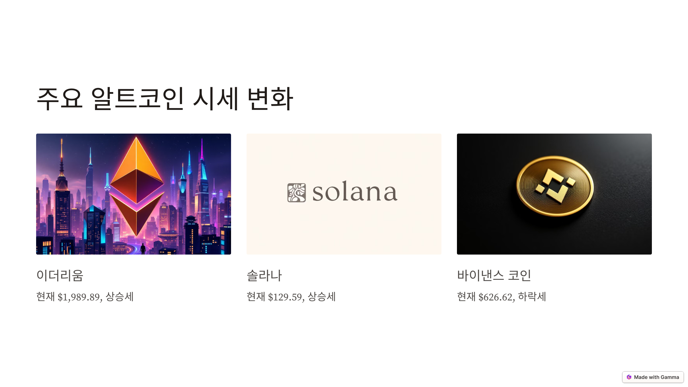- 유망 알트코인 발굴: 이더리움, 솔라나 등 기술적 발전이 기대되는 알트코인에 주목할 필요가 있습니다.