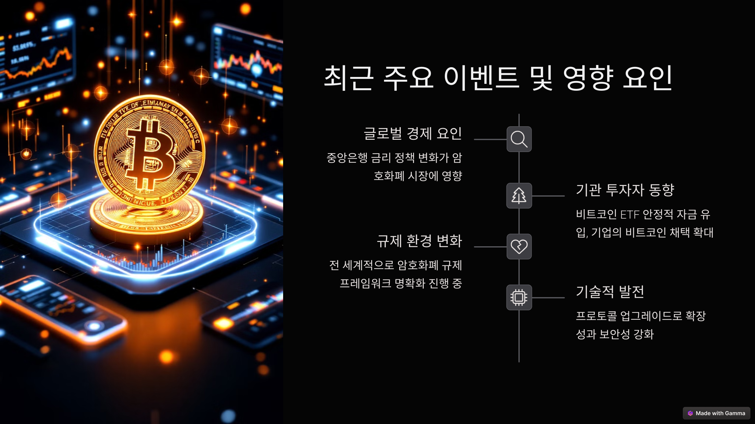 인플레이션, 금리 정책, 지정학적 긴장 등의 거시경제적 요인들은 암호화폐 시장에도 영향을 미칩니다. 글로벌 경제의 불확실성이 높아질 경우, 비트코인은 단기적으로는 위험 자산으로 인식될 수 있으나, 장기적으로는 인플레이션 헤지 자산으로서의 역할이 강화될 가능성이 있습니다.