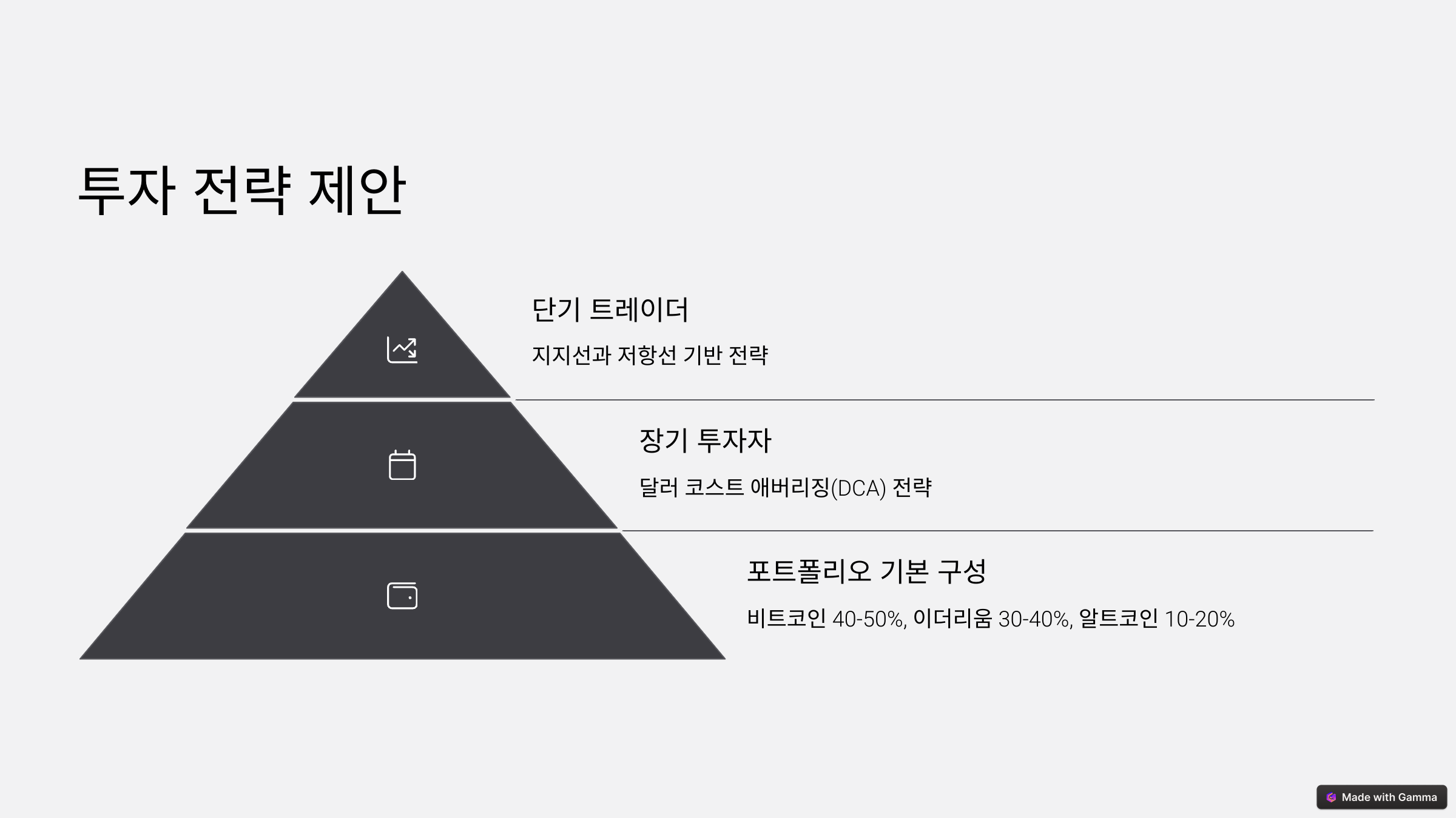 장기 투자자들에게는 여전히 달러 코스트 애버리징(DCA) 전략이 유효합니다. 시장의 단기적 변동성에 흔들리지 않고, 정기적으로 일정 금액을 투자하는 방식은 암호화폐의 높은 변동성을 관리하는 효과적인 방법입니다.